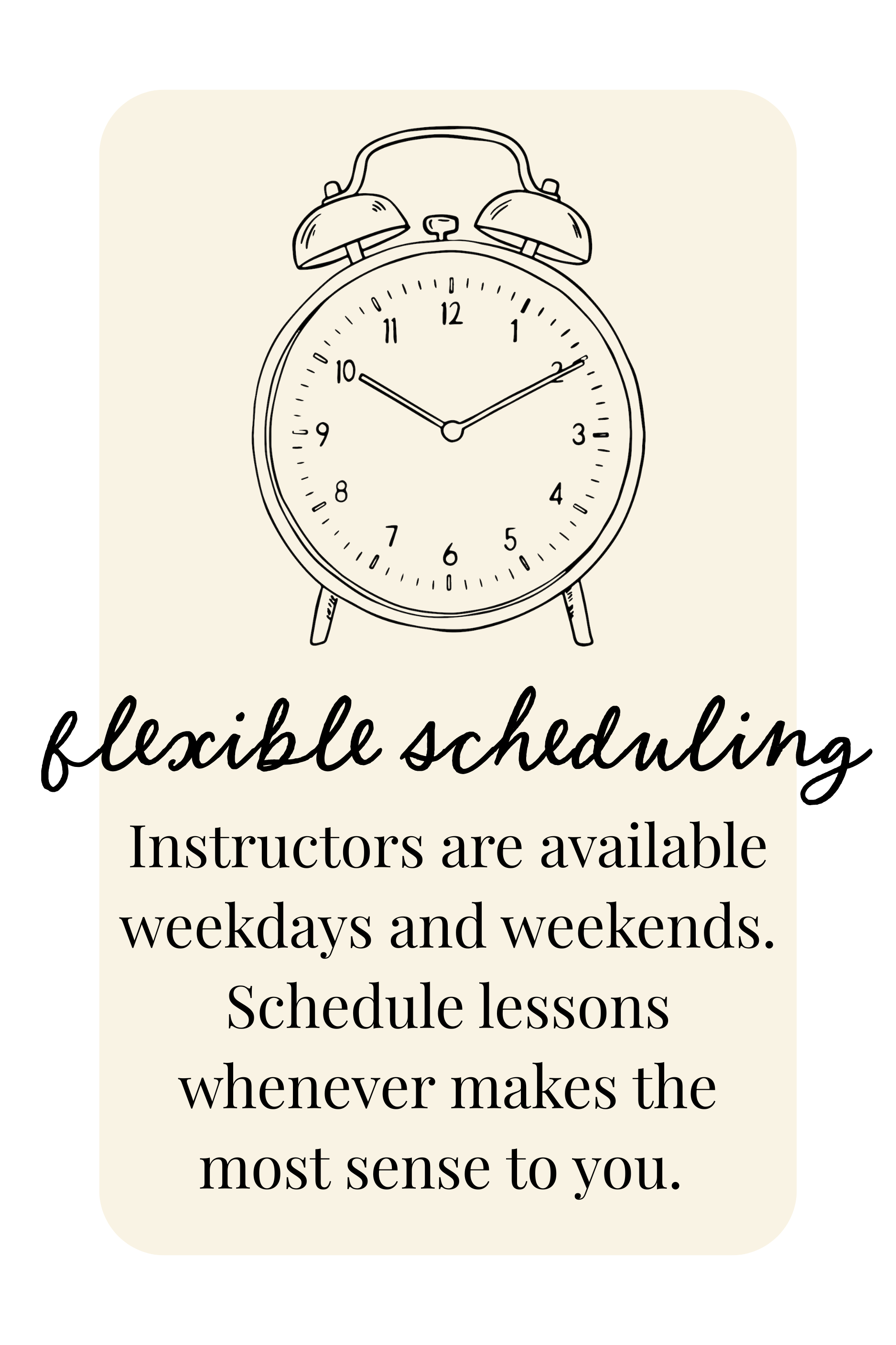 Once you’re matched with an instructor, we’ll get your first lesson scheduled! Most of our students take recurring weekly lessons. We’ll work together with you and your instructor to find a day and time that works for everyone.